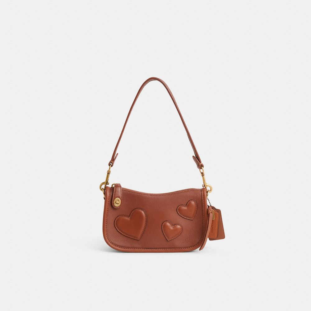 Lovingly reimagined by Eunice Chang with a smattering of crushworthy dimensional hearts in a sophisticated tone-on-tone color palette, this streamlined style has been expertly cleaned, conditioned and restored. Our talented craftspeople Jose Reyna, Fernando Gutierrez and Yngrid Pichardo Baez hand-decorated the front with plush heart appliqué, replaced the binding, D-rings, zipper pull O-ring, dogleashes and turnlock, refreshed the anchors, zipper pull, lining, the bottom, the back and the edgestain at the top, then added a playful repurposed charm. The Swinger 20 Bag is part of The Coach Originals, a collection of archival-inspired bags that celebrates our legacy and authentic New York heritage. This glovetanned leather style is based on a 1980s Coach design reimagined for today. Featuring our iconic turnlock closure, the petite bag sits just beneath the underarm with the short-strap or it can be carried as a clutch.