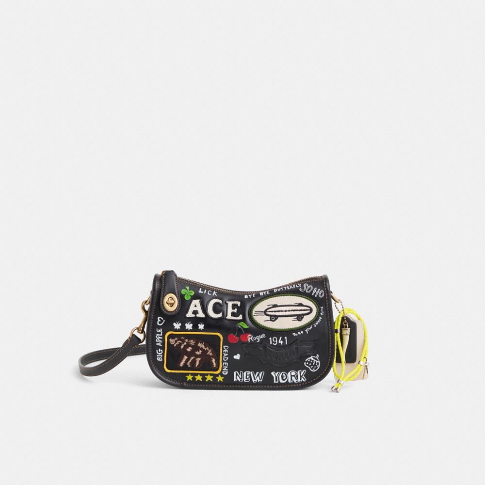 Reimagined with a streetwise attitude inspired by ‘90s skate culture by Rose Oliva featuring playful patches and graffiti doodles vibrantly hand-painted by Sarah Hoffman, this streamlined style has been expertly cleaned, conditioned and restored. Our talented craftspeople Jose Reyna and Michelle Barquet hand-decorated the front with dynamic patches, refreshed the exterior and interior, then added a playful repurposed charm. The Swinger Bag is part of The Coach Originals, a collection of archival-inspired bags that celebrates our legacy and authentic New York heritage. This glovetanned leather style is based on a 1987 Coach design reimagined for today. Featuring our iconic turnlock closure, the zip-top short-strap shoulder bag sits just beneath the underarm for hands-free convenience and includes a detachable strap to wear crossbody.