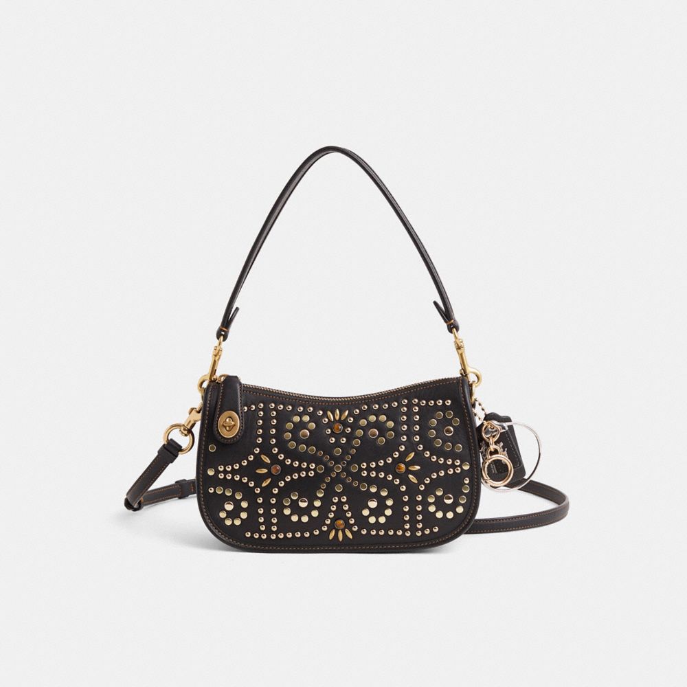 Reimagined by Rose Oliva with a cool Western-inspired bandana print motif featuring an intricate mix of colorful cabochons, prairie rivets and golden studs, this streamlined style has been expertly cleaned, conditioned and restored. Our talented craftsperson Alex Lodato embellished the front with gleaming rivets, refreshed the exterior, replaced the dogleash on shoulder strap, then added a long strap and a playful repurposed charm. The Swinger Bag is part of The Coach Originals, a collection of archival-inspired bags that celebrates our legacy and authentic New York heritage. This glovetanned leather style is based on a 1987 Coach design reimagined for today. Featuring our iconic turnlock closure, the zip-top short-strap shoulder bag sits just beneath the underarm for hands-free convenience and includes a detachable strap to wear crossbody.