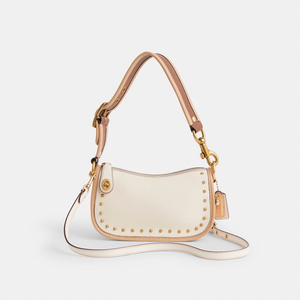 Reimagined by Eunice Chang with metallic border rivets and a Western-inspired buckled strap for a gleaming touch and a pop of color, this streamlined style has been expertly cleaned, conditioned and restored. Our talented craftspeople Nicole Izquierdo, Lucas Ortiz and Yngrid Pichardo Baez hand-decorated the front with golden border rivets, attached a buckled short strap, replaced the edge binding, refreshed the front, back and bottom, then added a playful repurposed charm. The Swinger Bag is part of The Coach Originals, a collection of archival-inspired bags that celebrates our legacy and authentic New York heritage. This glovetanned leather style is based on a 1987 Coach design reimagined for today. Featuring our iconic turnlock closure, the zip-top short-strap shoulder bag sits just beneath the underarm for hands-free convenience and includes a detachable strap to wear crossbody.