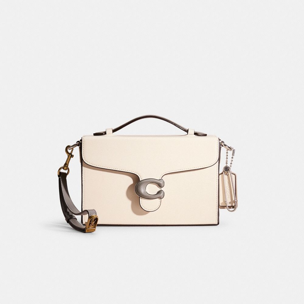 Reimagined with a sophisticated pop of grey by Eunice Chang, this flap-front style has been expertly cleaned, conditioned and restored. Our talented craftspeople Alfred Deaza and Yngrid Pichardo Baez re-covered the top handle and Signature hardware in a contrasting color, then added a matching wristlet and a playful repurposed charm. A modern take on an archival 1970s Coach design, our structured geometric Tabby box bag is crafted of buttery soft glovetanned leather. Finished with our Signature hardware, it features an expandable accordion opening for a little extra room when needed. The convenient convertible style can be worn four ways: as a wristlet, held by the top handle, slung on the shoulder or crossbody with the detachable adjustable strap.