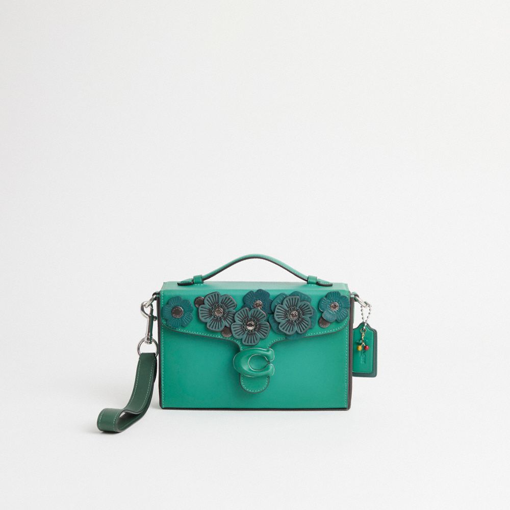 Reimagined by Savannah Sutton with a smattering of our dimensional Tea Rose appliqué in a bright blue color palette, this flap-front style has been expertly cleaned, conditioned and restored. Our talented craftsperson Alfred Deaza embellished the flap with die-cut leather blooms and gleaming peek-a-boo rivets, then added a wristlet and a playful repurposed charm. A modern take on an archival 1970s Coach design, our structured geometric Tabby box bag is crafted of buttery soft glovetanned leather. Finished with our leather-wrapped Signature hardware, it features an expandable accordion opening for a little extra room when needed. It can be worn four ways: as a wristlet, held by the top handle, slung on the shoulder or crossbody with the detachable adjustable strap.
