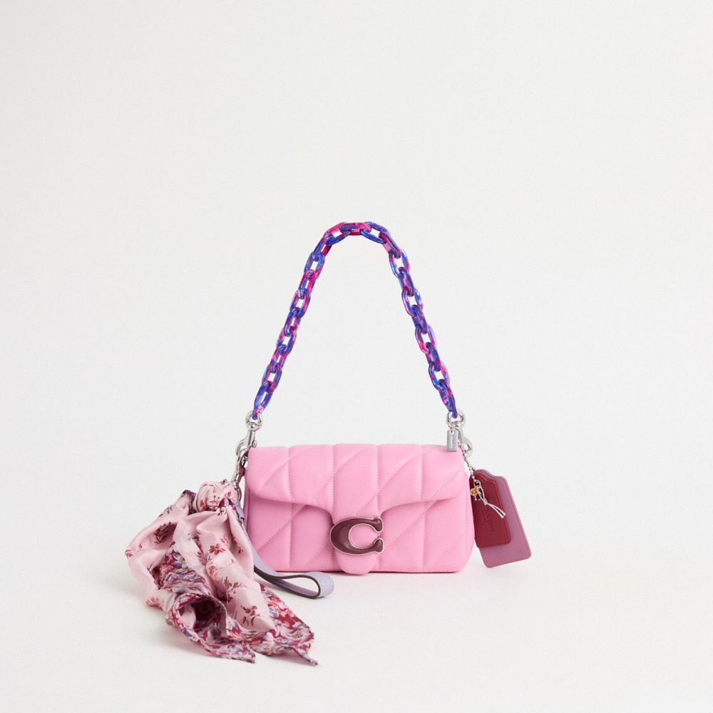 Reimagined with a chunky chain strap and a floral print scarf accent for a colorful pop and a sophisticated finish by Rose Oliva, this flap-front style has been expertly cleaned, conditioned and restored. Our talented craftsperson Jose Reyna attached a pop resin chain strap and a pop leather wristlet detailed with a floral silk scarf, painted our Signature hardware, then added a playful repurposed charm. A modern take on an archival 1970s Coach design, our Tabby Wristlet is crafted of quilted plush, ultra-soft nappa leather. The versatile style is perfectly sized for cards, cash and a phone with an exterior slip pocket for easy access to essentials. Finished with our Signature hardware for an iconic touch, it can be carried as a wristlet or a clutch and worn crossbody with the elegant chain strap.