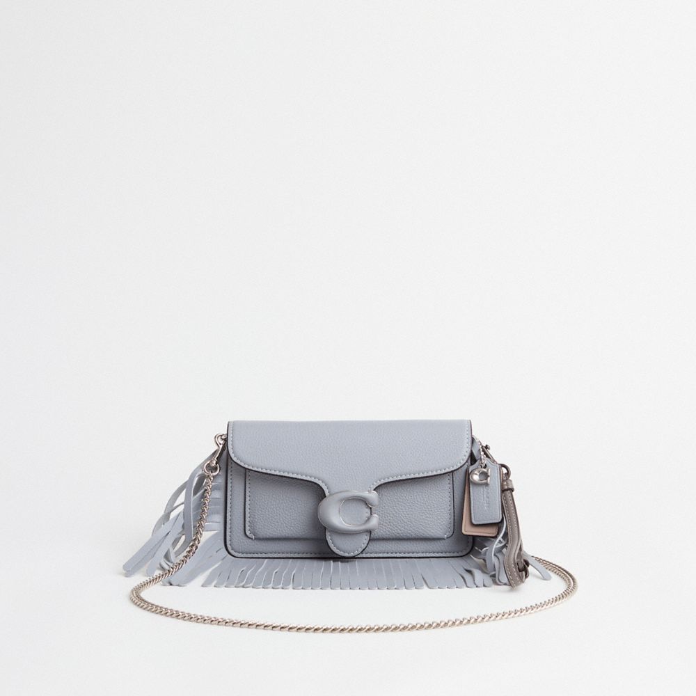 Reimagined with lavish layers of dense fringe for a sleek swingy finish by Eunice Chang, this flap-front style has been expertly cleaned, conditioned and restored. Our talented craftspeople Jose Reyna and Yngrid Pichardo Baez embellished it by hand with leather fringe along the edges, then added a wristlet strap and playful repurposed charm. A modern take on an archival 1970s Coach design, our structured Tabby wristlet is crafted of polished pebble leather. Finished with our Signature hardware, it's perfectly sized for cards, cash and a phone with an exterior slip pocket for easy access to essentials. It can be carried as a wristlet or a clutch and worn crossbody with the elegant chain strap, making it the perfect choice for both dressed up and casual looks.