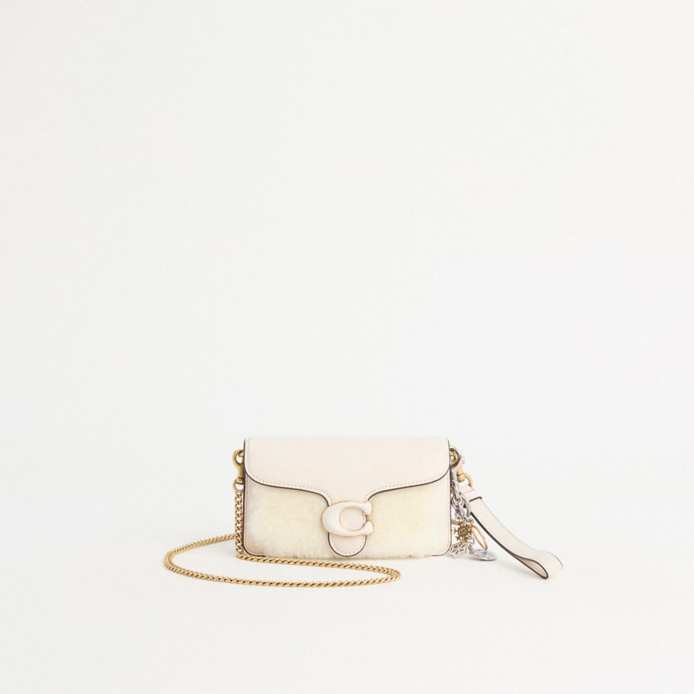 Reimagined with a cozy-luxe look by Eunice Chang featuring a plush shearling pocket, this flap-front style has been expertly cleaned, conditioned and restored. Our talented craftspeople Jose Reyna and Alfred Deaza applied a super soft shearling panel to the front pocket, re-covered the Signature hardware and added a playful repurposed charm. A modern take on an archival 1970s Coach design, our structured Tabby wristlet is crafted of polished pebble leather. Finished with our Signature hardware, it's perfectly sized for cards, cash and a phone with an exterior slip pocket for easy access to essentials. The versatile style can be carried as a wristlet or a clutch and worn crossbody with the elegant chain strap, making it the perfect choice for both dressed up and casual looks.