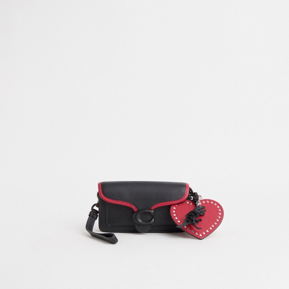 Lovingly reimagined with a bold pop of color by Eunice Chang featuring a sharp graphic edge and an oversized studded heart charm for a bit of shine, this flap-front style has been expertly cleaned, conditioned and restored. Our talented craftspeople Jose Reyna, Alfred Deaza and Yngrid Pichardo Baez hand-decorated the flap with bold red binding, then added a playful repurposed charm featuring a ferociously fun dinosaur and a turnlock leather case. A modern take on an archival 1970s Coach design, our structured Tabby wristlet is crafted of polished pebble leather. Finished with our Signature hardware, it's perfectly sized for cards, cash and a phone with an exterior slip pocket for easy access to essentials. The versatile style can be carried as a wristlet or a clutch and worn crossbody with the elegant chain strap, making it the perfect choice for both dressed up and casual looks.