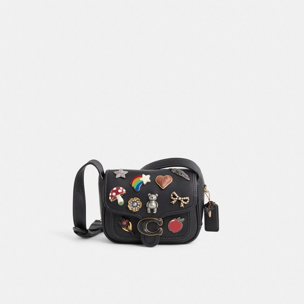 Reimagined with loads of iconic Coach pins by Eunice Chang for a whimsical finish, this flap-front style has been expertly cleaned, conditioned and restored. Our talented craftspeople Ella Mulley and Jose Reyna hand-decorated the flap and front with a mix of eclectic embellishments, refreshed the back pocket and bottom, then added a playful repurposed charm. Crafted of polished pebble leather and refined leather, our versatile Tabby Messenger 19 is a modern take on an archival 1970s Coach design. Finished with our Signature hardware, the compact structured bag has secure interior snap and zip pockets for easy organization and an outside pocket to keep essentials close at hand. The wide adjustable crossbody strap offers all day comfort.