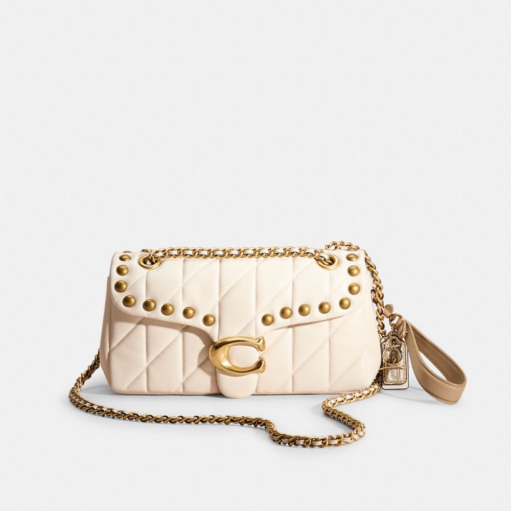 Reimagined by Rose Oliva with golden border rivets for a gleaming touch, this flap-front style has been expertly cleaned, conditioned and restored. Our talented craftsperson Jose Reyna embellished the flap with polished studs, painted the corners, refreshed the interior and added a playful repurposed charm. A modern take on an archival 1970s Coach design, our structured Tabby shoulder bag is crafted of quilted plush, ultra-soft nappa leather. Finished with our Signature hardware for an iconic touch, the compact 26 features a long leather chain strap to wear crossbody or double up for a shorter, dressier look.