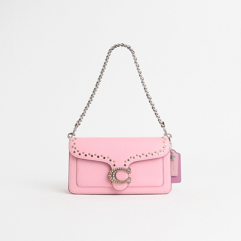Reimagined by Rose Oliva with gleaming border rivets and our crystal-embellished Signature for a sparkling finish, this flap-front style has been expertly cleaned, conditioned and restored. Our talented craftspeople Jose Reyna and Yngrid Pichardo Baez hand-decorated the front with striking studs, replaced our Signature hardware with a crystal-embellished one, attached a chain strap with woven snakeskin lacing ending with a knot, then added a long strap and a playful repurposed charm. A modern take on an archival 1970s Coach design, our structured Tabby shoulder bag is crafted of polished pebble leather. Finished with our Signature hardware for an iconic touch, the compact 26 features two detachable straps to carry by hand, style as a short shoulder bag or wear crossbody.