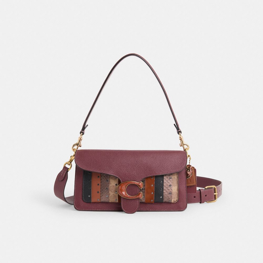 Reimagined by Eunice Chang with a dynamic textured patchwork pocket in a starkly dramatic color palette, this flap-front style has been expertly cleaned, conditioned and restored. Our talented craftspeople Jose Reyna and Yngrid Pichardo Baez incorporated Coach remnant materials embellished with polished studs as an outside pocket, repaired edgestain on back, then added a playful repurposed charm. A modern take on an archival 1970s Coach design, our structured Tabby shoulder bag is crafted of polished pebble leather. Finished with our Signature hardware in marbled resin, the compact 26 features two detachable straps to carry by hand, style as a short shoulder bag or wear crossbody.