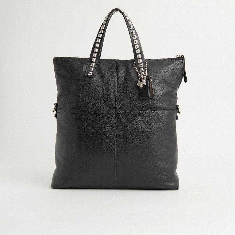 Reimagined by Rose Oliva with silvery pyramid studs for an industrial-inspired edge, this take-everywhere style has been expertly cleaned, conditioned and restored. Our talented craftspeople Jose Reyna and Yngrid Pichardo Baez hand-decorated the handles with polished studs, painted the zipper pull and handles, spot-painted the corners and bottom, repaired the zipper gusset edgestain, then added a playful repurposed charm. Messenger meets tote in a very modern silhouette made with old-world craftsmanship and luxury materials: soft, fine-grained leather trimmed with very premium Italian belt leather for the handles and strap.