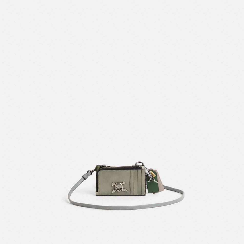 Reimagined from individual card cases into a petite crossbody bag by Rose Oliva with three times the space and three times the organization, this hybrid style has been expertly cleaned, conditioned and restored. Our talented craftsperson Fernando Gutierrez sewed three card cases back-to-back, attached anchors, affixed a striking skull pin to the exterior, then added a long leather strap, a Signature nylon and leather wristlet strap and a playful repurposed charm. This convenient card case creation is crafted of smooth leather that has been specially dyed by hand for a burnished effect. Each card case has four card slots and an expandable zip compartment for coins, cash or receipts.