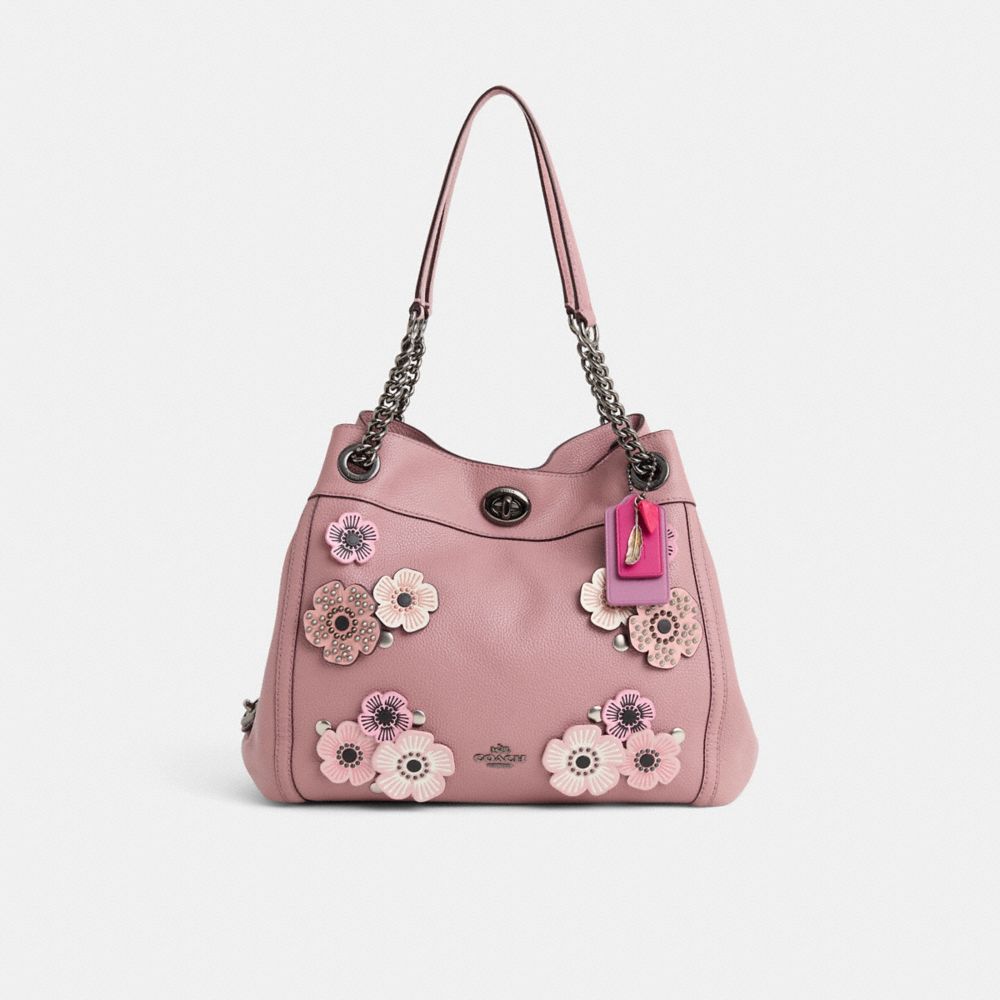 Reimagined with a pretty in pink and purple color pops featuring clusters of our dimensional Tea Rose appliqué by Eunice Chang, this go-everywhere style has been expertly cleaned, conditioned and restored. Our talented craftsperson Jose Reyna hand-decorated the front with die-cut leather blooms and gleaming peek-a-boo rivets, spot-painted strap grommets, repaired the edgestain on back, then added a playful repurposed charm. Edie combines downtown ease with utility. Crafted of polished pebble leather, it features a three-compartment interior designed for perfect organization that secures with a signature Coach turnlock.