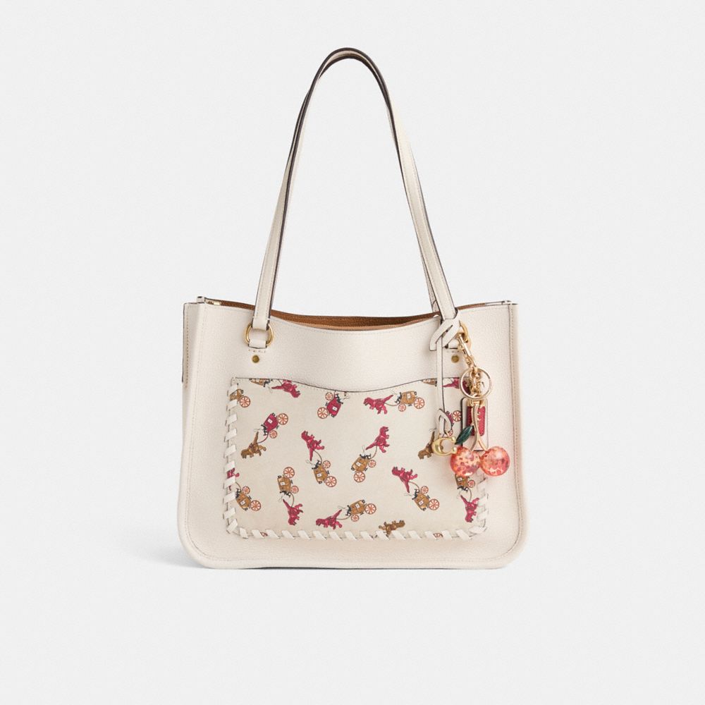 Reimagined with a graphic pop front pocket by Macshella Oduro featuring a whimsical twist on our iconic Horse and Carriage motif featuring fun-loving Coach mascot Rexy, this streamlined style has been expertly cleaned, conditioned and restored. Our talented craftspeople Fernando Gutierrez, Alfred Deaza and Yngrid Pichardo Baez hand-decorated the front with a repurposed suede panel as an outside pocket, finished it with whipstitch detailing, repaired the edgestain, then added a playful repurposed charm. Crafted of polished pebble leather, the timeless Tyler carryall is perfectly organized with a divided interior, central zip pocket and multifunction pockets for your phone and other small essentials. It’s finished with a leather hangtag and our Signature charm for an iconic touch.