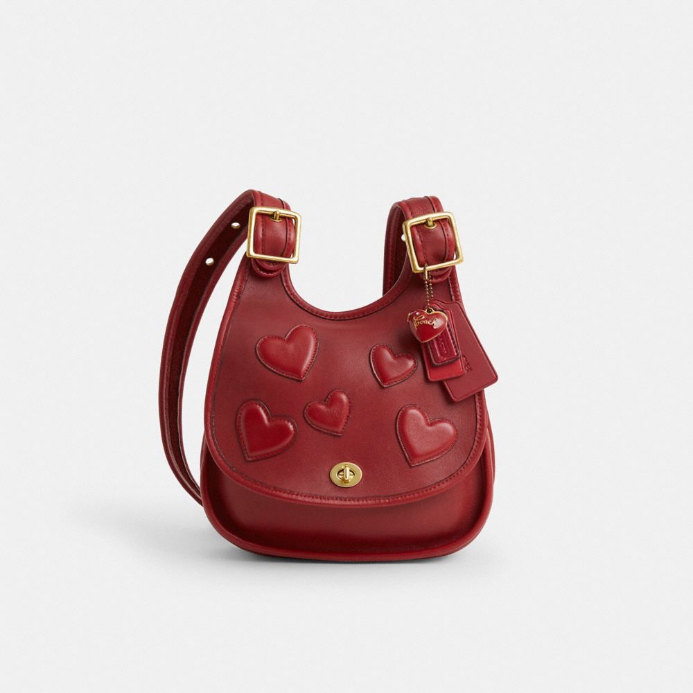 Reimagined with a whole lotta love by Eunice Chang featuring our dimensional plush heart appliqué in tonal red, this spacious style has been expertly cleaned, conditioned and restored. Our talented craftspeople Fernando Gutierrez, Jose Reyna and Yngrid Pichardo Baez hand-decorated the flap with an array of scattered heart appliqué, replaced all the binding on the bag and strap, polished the hardware and added a playful repurposed charm. This vintage Berkeley Saddle Bag is a beloved Coach silhouette first introduced in 1996. Crafted of rich leather, it keeps your essentials secure with a flap front finished with a turnlock closure. This everyday silhouette features an inside zip pocket to organize your small essentials.