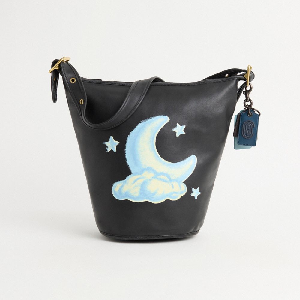 Reimagined by Eunice Chang with a nostalgic dreamy moon graphic delightfully hand-painted by Rose Oliva, this zip-top style has been expertly cleaned, conditioned and restored. It’s finished with a playful repurposed charm. This vintage Duffle Sac Buckle Bag is a beloved Coach silhouette first introduced in 1989. Designed with a spacious interior, our glovetanned leather Duffle features an inside multifunction pocket and luxe leather lining.
