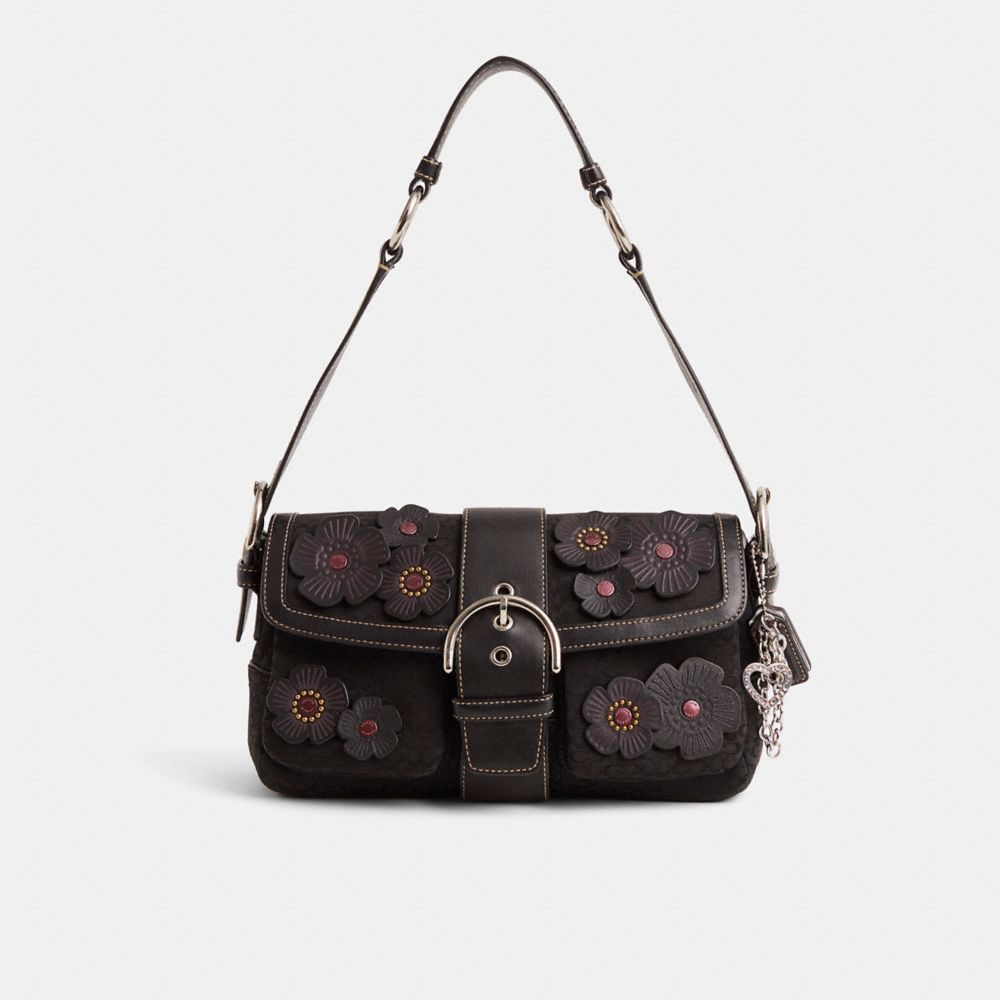 Reimagined with clusters of moody and tonal dimensional Tea Rose appliqué by Rose Oliva for a darkly romantic finish, this flap-front style has been expertly cleaned, conditioned and restored. Our talented craftspeople Ella Mulley and Yngrid Pichardo Baez embellished the flap and front with die-cut leather blooms, polished the leather on the strap and tab closure, repaired strap edgestain, replaced the buckles, then added a playful repurposed charm. The Mini Soho Pocket Flap Bag was first introduced in 2004. Crafted of our Signature jacquard and leather, it’s detailed with contrast topstitching and secures with a buckled tab closure.