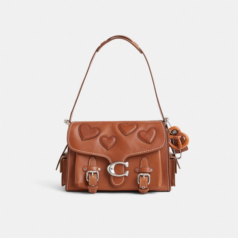 Lovingly reimagined by Eunice Chang with a smattering of crushworthy dimensional hearts in a sophisticated tone-on-tone color palette, this flap-front style has been expertly cleaned, conditioned and restored. Our talented craftspeople Jose Reyna, Fernando Gutierrez and Yngrid Pichardo Baez hand-decorated the flap with plush heart appliqué, spot-painted the flap and added a playful repurposed charm. The Western Tabby reimagines our structured take on an archival 1970s Coach design with a slouchy relaxed feel. Finished with Western-inspired buckle accents, side cargo pockets detailed with turnlock closures and our Signature hardware, this natural grain leather shoulder bag features zip pockets inside and out to organize small accessories and two straps to carry by hand, style as a short shoulder bag or wear crossbody.