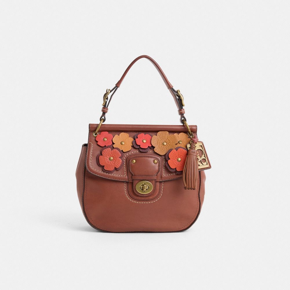 Reimagined by Savannah Sutton with a warm winter medley of dimensional Tea Rose appliqué front and back, this sophisticated style has been expertly cleaned, conditioned and restored. Our talented craftsperson Nicole Izquierdo hand-decorated the flap and back with die-cut leather blooms, painted the corners and edgestains, then added a playful repurposed charm. Based on an archival Coach silhouette, our soft leather Willis bag features a dowel frame and secures with a turnlock closure. Carry by the top handle or the detachable crossbody strap for versatile wear.