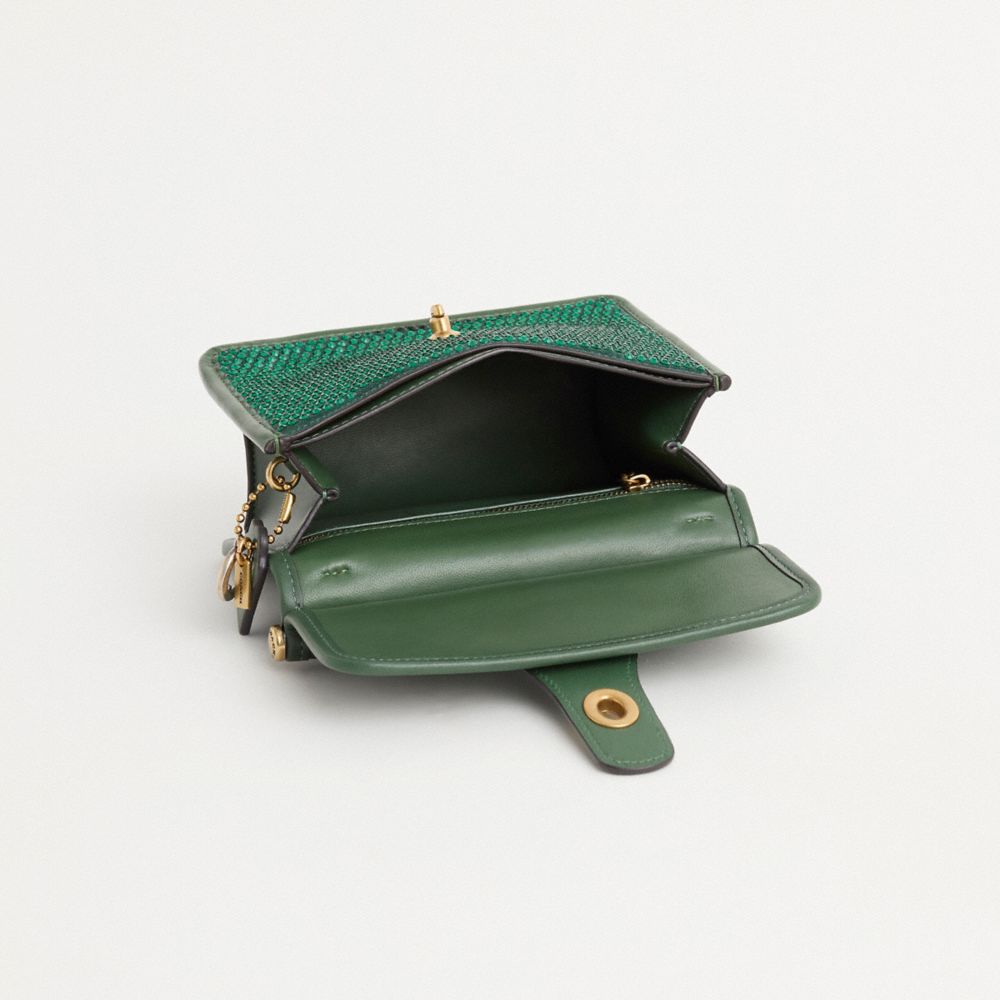 Reimagined by Eunice Chang with a pop of glistening green crystals for a dazzling accent, this flap-front style has been expertly cleaned, conditioned and restored. Our talented craftspeople Jose Reyna, Alfred Deaza and Yngrid Pichardo Baez applied a crystal embellished panel to the front, replaced the pocket binding, repaired the D-ring, then added a long strap and a playful repurposed charm. Reimagined for today, this Willis is a structured everyday bag based on an iconic Coach silhouette introduced in the 1990s. Featuring a dowel frame, this compact 18 is crafted of our buttery soft glovetanned leather and secures with a turnlock closure. Carry by the top handle or attach the strap and wear it crossbody.