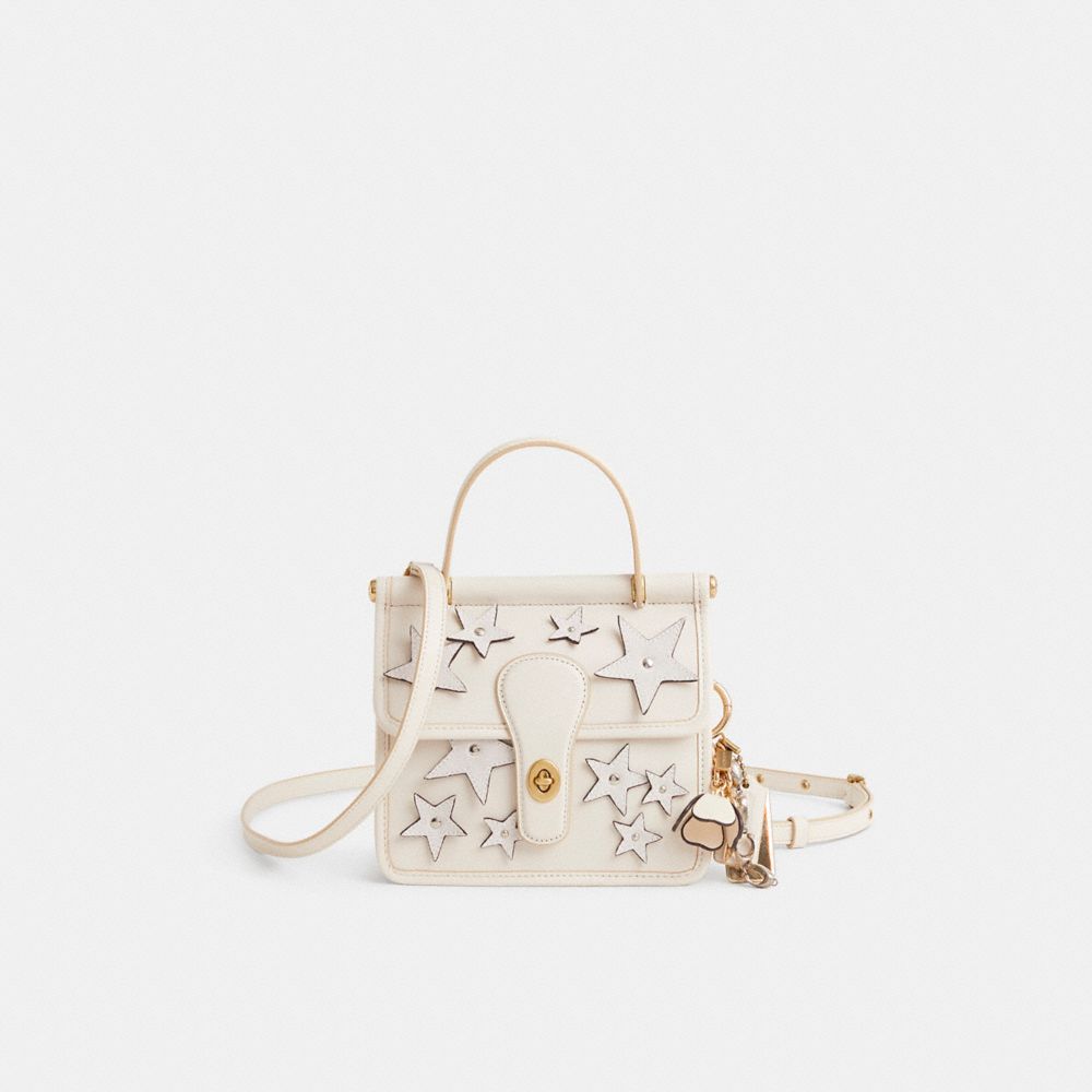 Reimagined by Eunice Chang with a dreamy star motif, this flap-front style has been expertly cleaned, conditioned and restored. Our talented craftspeople Nicole Izquierdo, Fernando Gutierrez and Yngrid Pichardo Baez hand-decorated the flap and front with tonal suede star appliqué, refreshed the back and base, then added a playful repurposed charm. The Willis is part of The Coach Originals, a collection of archival-inspired and vintage bags that celebrates our legacy and authentic New York heritage. Reimagined for today, this top handle design is a structured everyday bag based on an iconic Coach silhouette introduced in the 1990s. Featuring a dowel frame, the compact 18 is crafted of our buttery soft glovetanned leather and secures with a turnlock closure. Carry by the top handle or attach the strap and wear it crossbody.