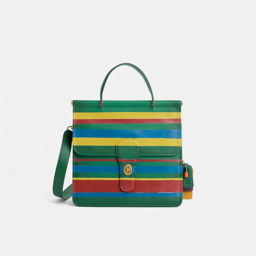 Brightly hand-painted by Rose Oliva in a bold mix of colorful statement-making stripes, this structured style has been expertly cleaned, conditioned and restored. Our talented craftsperson Nicole Izquierdo reshaped the top handle, replaced dowel hardware and added a playful repurposed charm. The Willis is part of The Coach Originals, a collection of archival-inspired and vintage bags that celebrates our legacy and authentic New York heritage. Reimagined for today, this top handle design is an everyday bag based on an iconic Coach silhouette introduced in the 1990s. Featuring the same dowel frame that made the original a favorite, it's crafted of our buttery soft glovetanned leather and secures with a turnlock closure. Carry by the top handle or attach the strap and wear it crossbody.