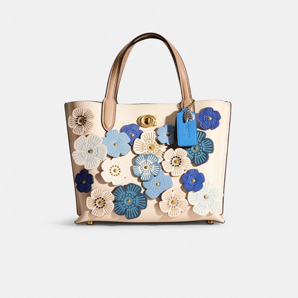 Reimagined with a blooming abundance of our dimensional Tea Rose appliqué by Eunice Chang in a summery white and blue denim-inspired color palette, this carry-it-all style has been expertly cleaned, conditioned and restored. Our talented craftspeople Nicole Izquierdo and Jose Reyna embellished the front and back with die-cut leather blooms, replaced the turnlock closure, then added a long strap and a playful repurposed charm. Not too big, not too small, Willow has space for all of your day-to-day essentials. Crafted of polished pebble leather, the 24 features two open pockets, a secure center zip compartment and our Signature turnlock closure. Carry it by the top handles or wear on the shoulder and crossbody with the detachable strap.