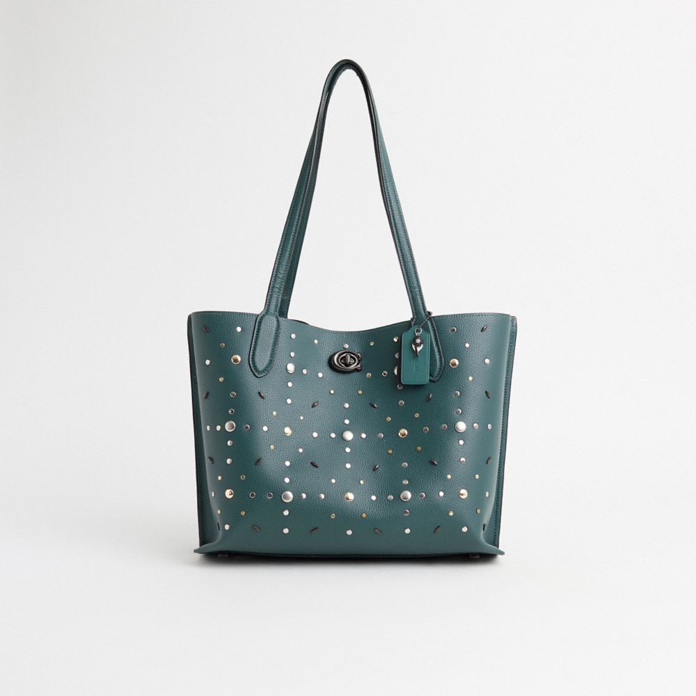 Reimagined by Savannah Sutton with striking prairie rivet detailing featuring gleaming mixed-metal studs and bold cabochons, this carry-it-all style has been expertly cleaned, conditioned and restored. Our talented craftsperson Nicole Izquierdo embellished the front with polished hardware, repaired stitching, then added a playful repurposed charm. Not too big, not too small, Willow is the perfect tote with space for all of your day-to-day essentials. Crafted of polished pebble leather, it features two open pockets, a secure center zip compartment and slender shoulder straps designed with a longer drop to fit comfortably over coats. Finished with our Signature turnlock closure, it fits up to a 13" laptop.