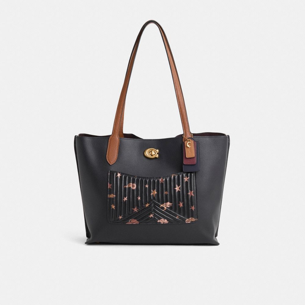 Reimagined by Rose Oliva and Macshella Oduro with a pop of color and a convenient front pocket featuring a celestial star and cloud motif, this take-everywhere style has been expertly cleaned, conditioned and restored. Our talented craftspeople Jose Reyna, Alfred Deaza and Yngrid Pichardo Baez incorporated a quilted leather Coach remnant as an outside pocket, switched out the handles with soft toned neutral pop leather ones, replaced the Signature turnlock, repaired edgestains, threads and the interior back tab stitching, then added a playful repurposed charm. Not too big, not too small, Willow is the perfect carry-it-all tote with space for all of your day-to-day essentials. Crafted of polished pebble leather, it features two open pockets, a secure center zip compartment and slender shoulder straps designed with a longer drop to fit comfortably over coats. Finished with our Signature turnlock closure, it fits up to a 13" laptop.