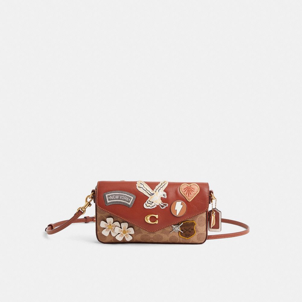 Reimagined with a whimsical Varsity vibe by Lucas Ortiz featuring eclectic Coach embellishments, this slim design has been expertly cleaned, conditioned and restored. Our talented craftspeople Lucas Ortiz and Nicole Izquierdo hand-decorated the front and back with an array of patches and pins, replaced our Signature hardware and D-rings, then added a playful repurposed charm. Crafted of refined leather and our Signature canvas detailed with our Signature hardware, our Wyn invites organization with an elegant envelope design. Finished with an exterior slip pocket, it features an open interior with a removable zip pouch that can be used on its own. Wear crossbody, on the shoulder or carry as a clutch.